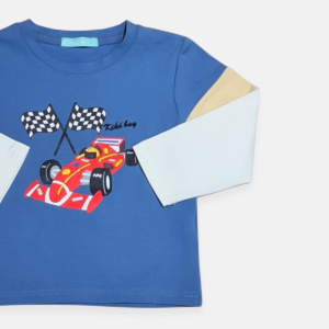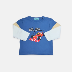 O destaque fica por conta da estampa de carro de corrida com bandeiras quadriculadas, que traz um visual moderno e cheio de personalidade. O design em azul com mangas em cores contrastantes deixa a peça ainda mais estilosa  e fácil de combinar com calças jeans, moletom ou bermudas.
