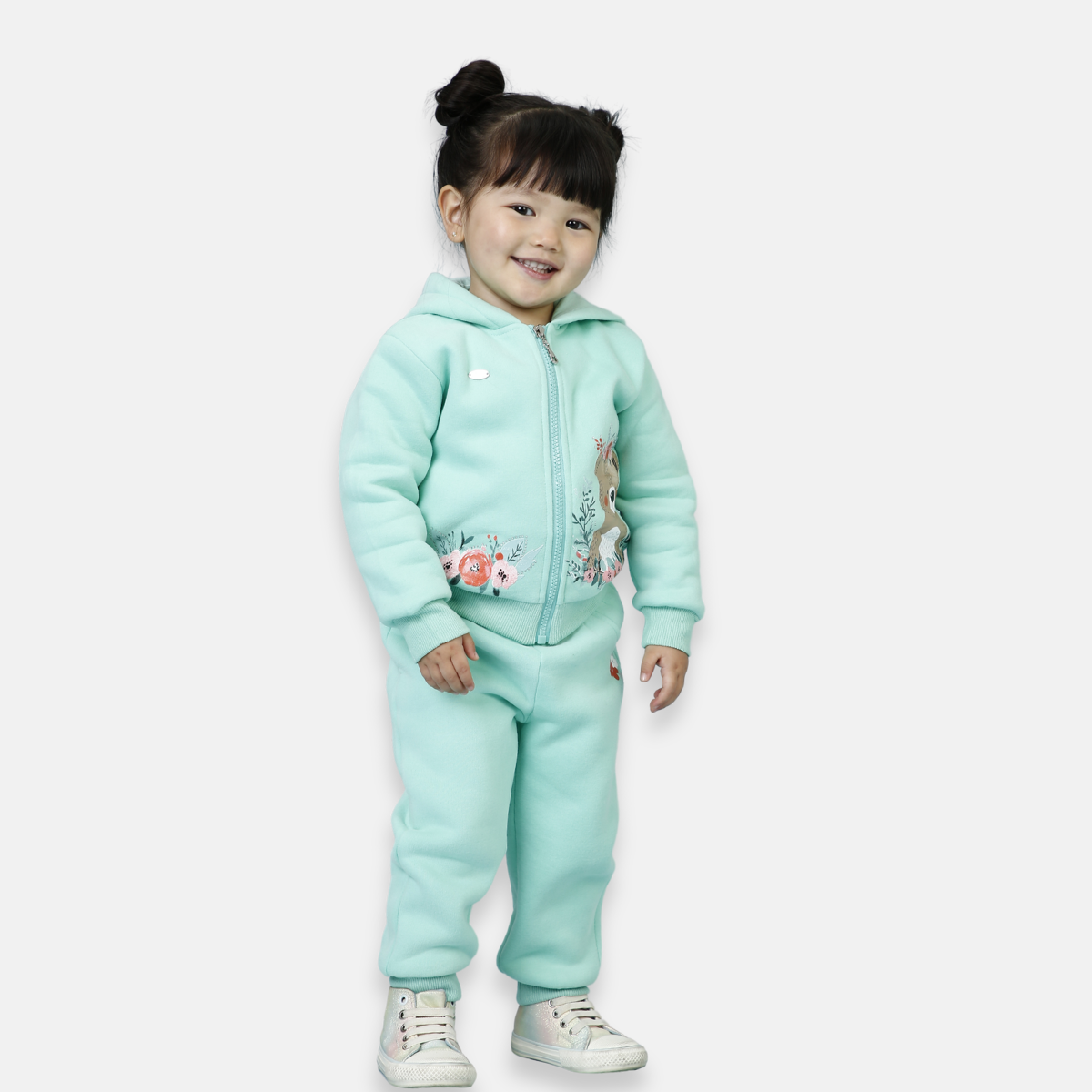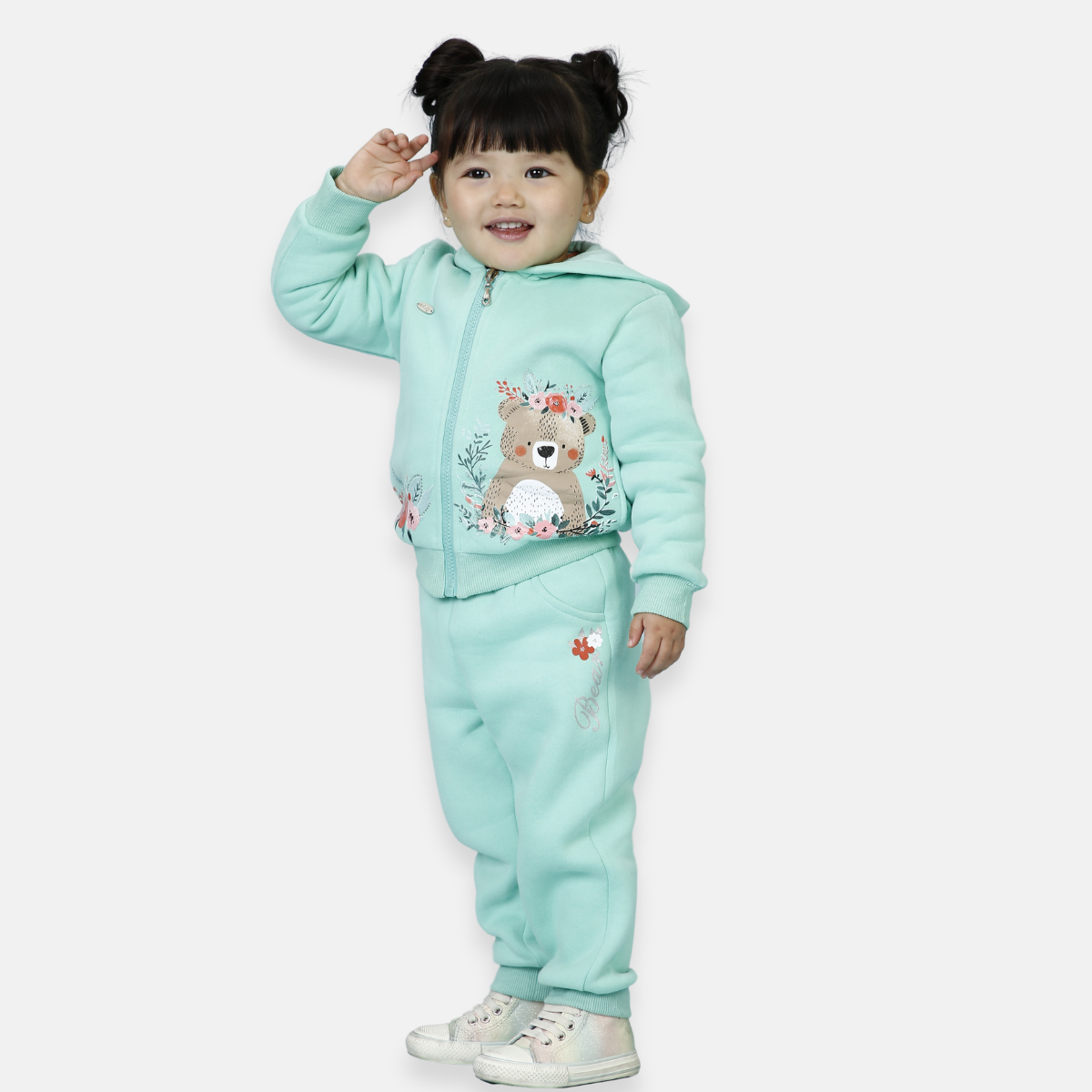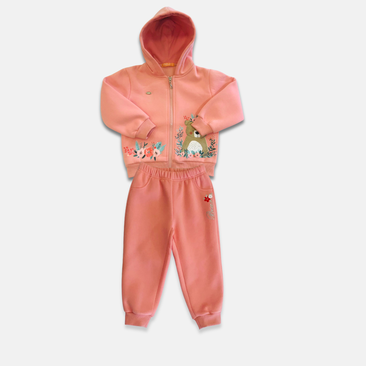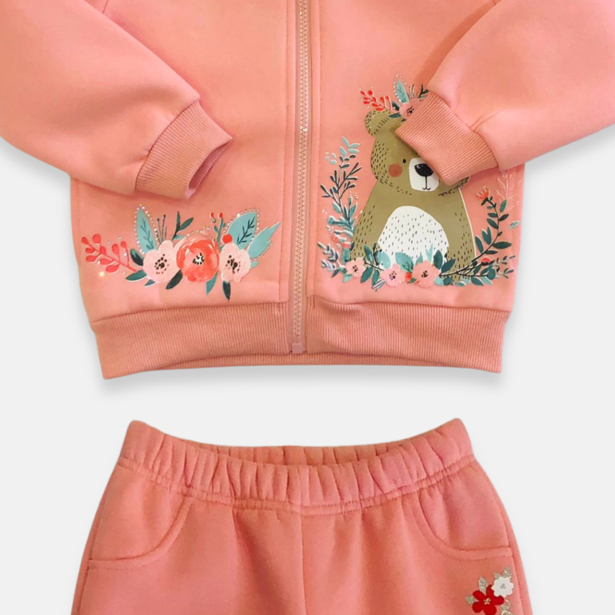 Esse lindo conjunto de moletom é perfeito para manter as pequenas quentinhas e cheias de estilo nos dias mais fresquinhos. A jaqueta possui capuz, fechamento em zíper e um charme especial com estampa de ursinho delicado cercado por flores, trazendo um toque fofo e encantador ao look.