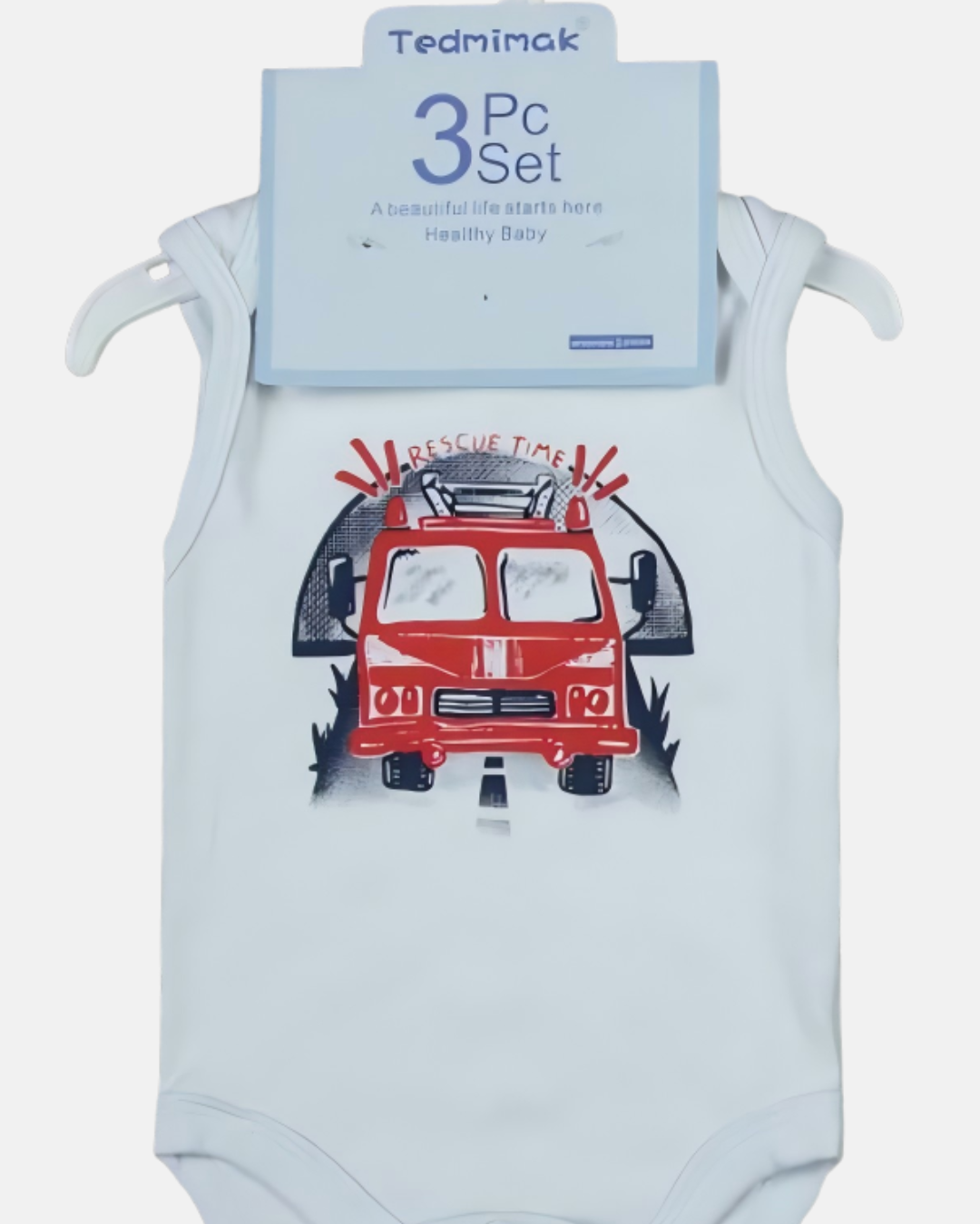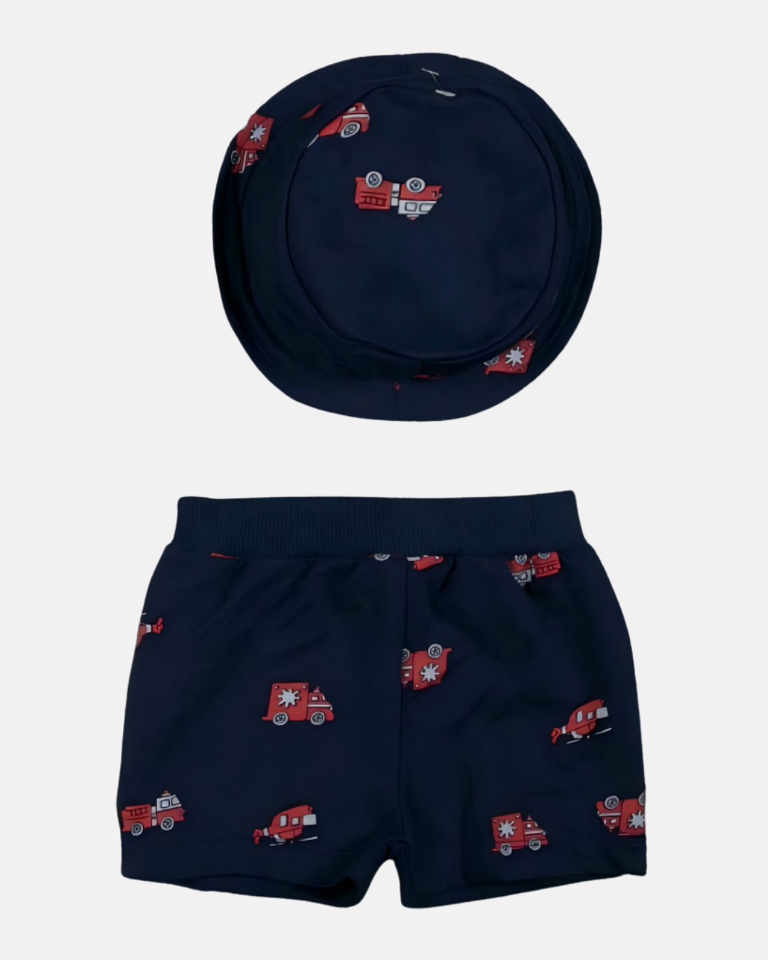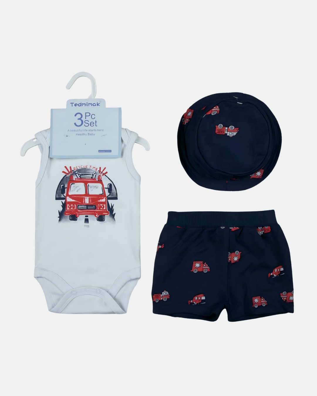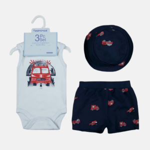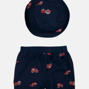 O body regata em tom claro possui estampa de caminhão de bombeiro com a frase “Rescue Time”, deixando o look ainda mais estiloso. O short em tom escuro conta com estampa de veículos, oferecendo contraste e praticidade com cós elástico para melhor ajuste. Para completar, o chapéu combina perfeitamente com o conjunto, protegendo e trazendo um charme extra.