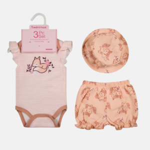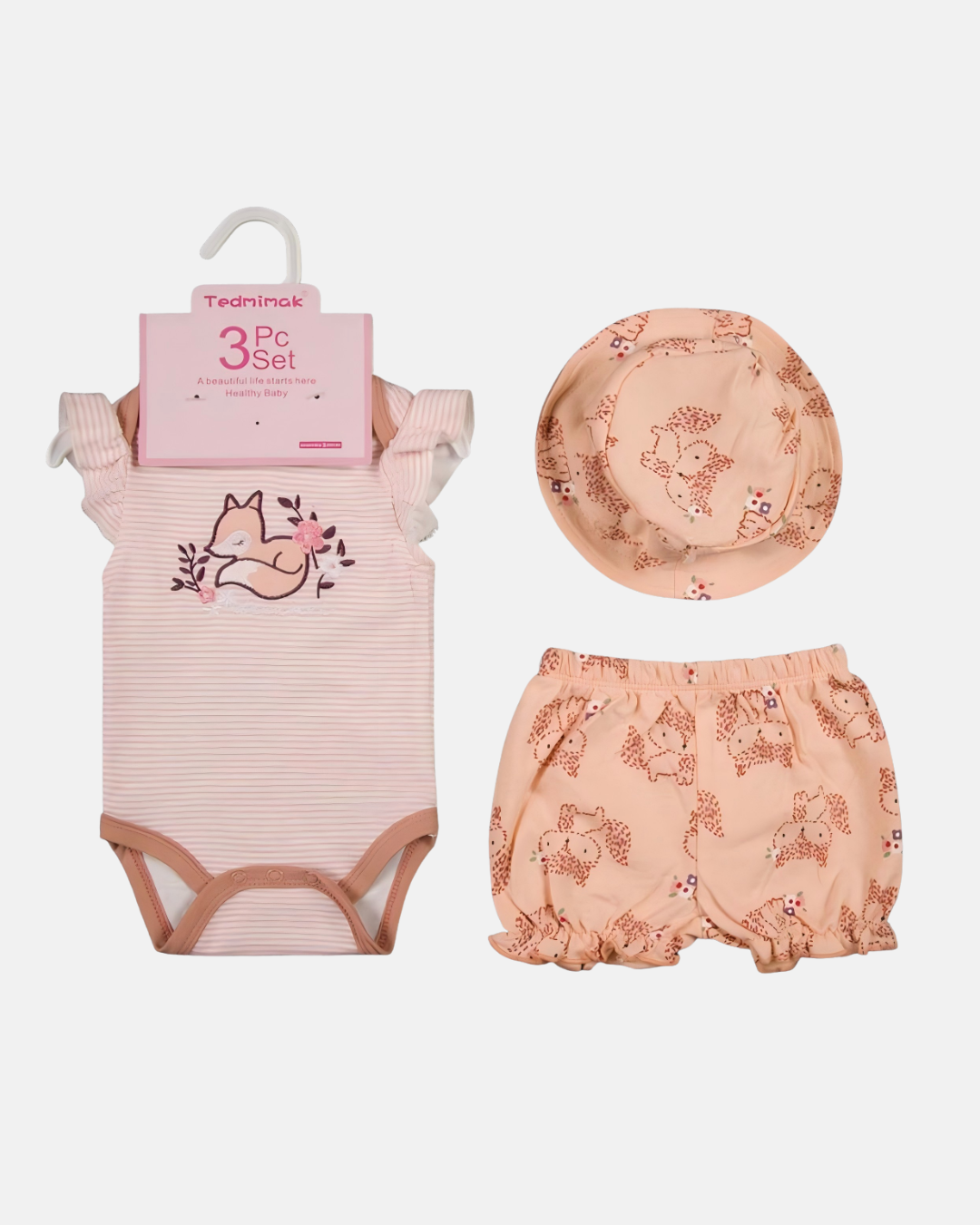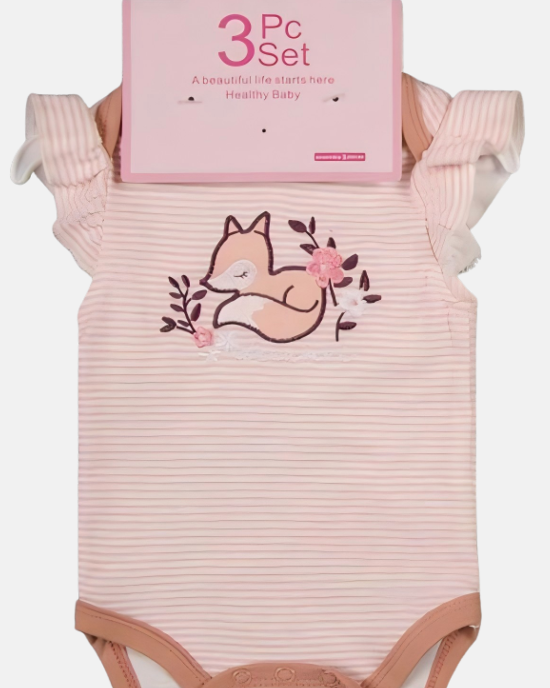 Um conjunto perfeito para deixar sua bebê ainda mais linda e confortável! Esse kit com 3 peças combina suavidade, estilo e praticidade, trazendo uma proposta delicada com estampa de raposinha e detalhes florais encantadores.