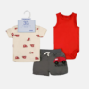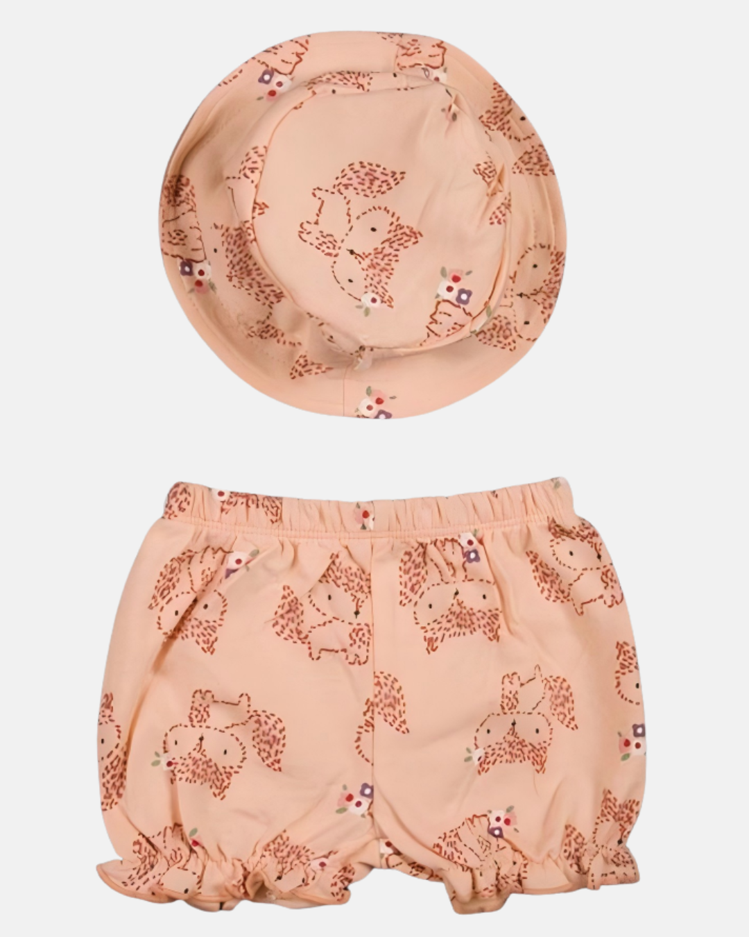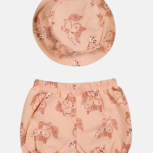 O body em listras suaves possui aplicação de raposinha, trazendo um charme especial ao look. O short estampado conta com modelagem confortável e detalhe franzido nas perninhas, deixando a peça ainda mais delicada. Para completar, o chapéuzinho combina perfeitamente com o conjunto, protegendo e dando um toque extra de estilo.