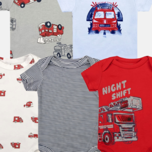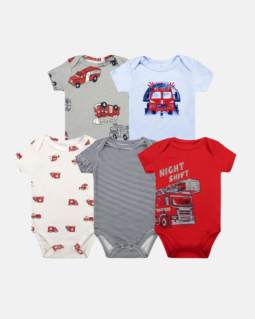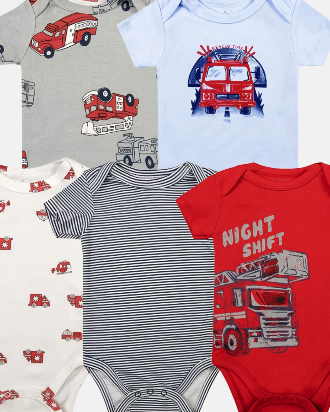 Esse kit com 5 body é perfeito para os pequenos que adoram aventura! Com estampas inspiradas no universo de bombeiros, cada peça traz um visual divertido e cheio de personalidade, com cores vibrantes e detalhes que encantam.
