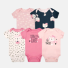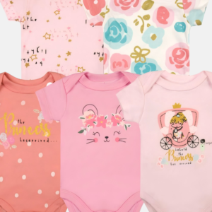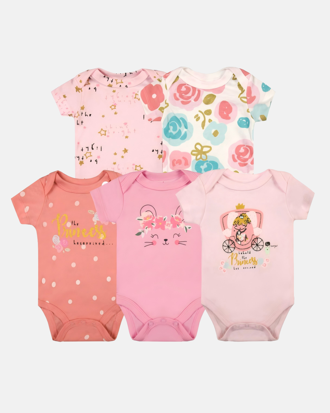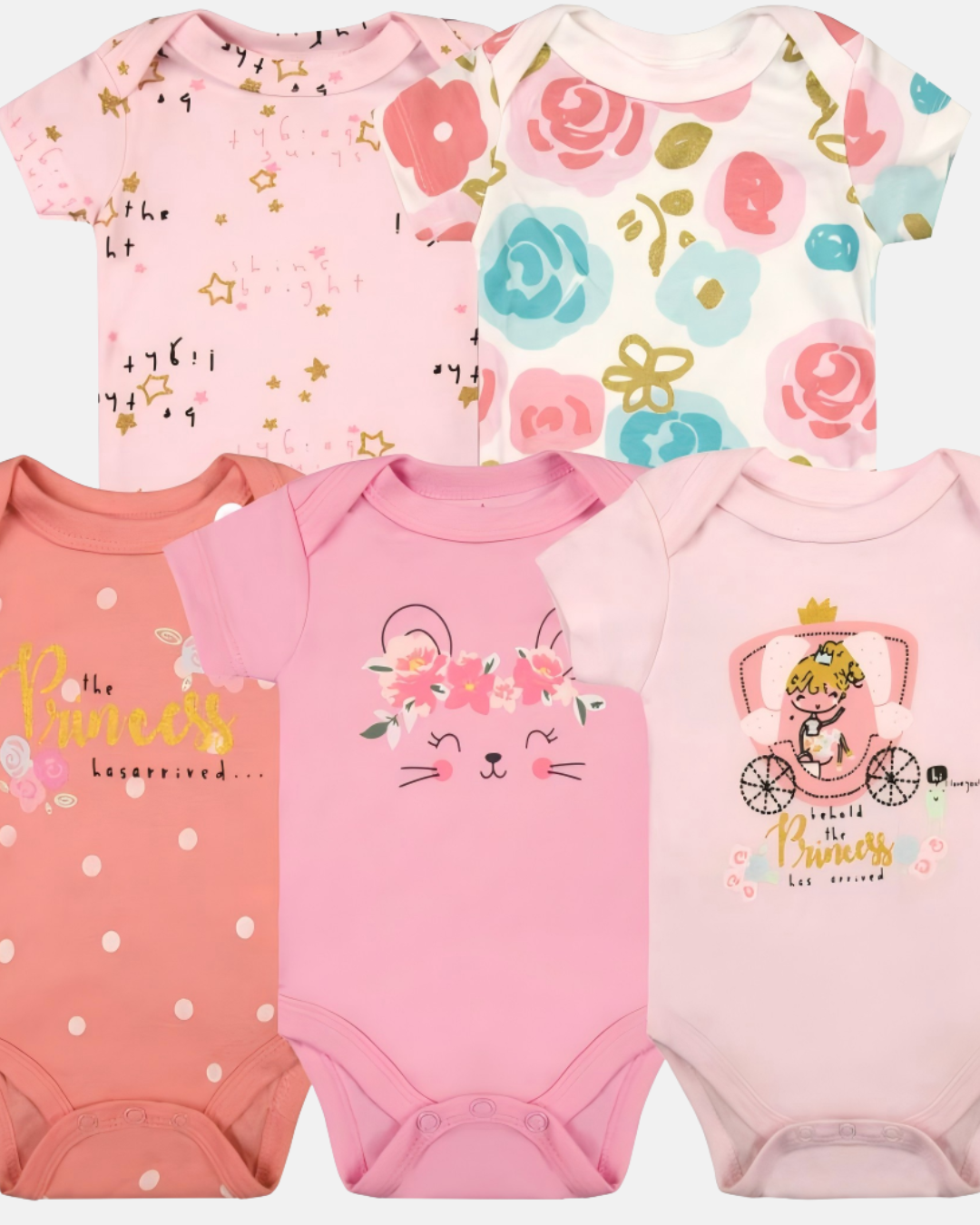 Um kit encantador com 5 bodys perfeitos para deixar sua bebê ainda mais linda e confortável! Com estampas delicadas que misturam flores, poá, coelhinho e tema princesa, cada peça traz um toque especial de doçura e elegância.