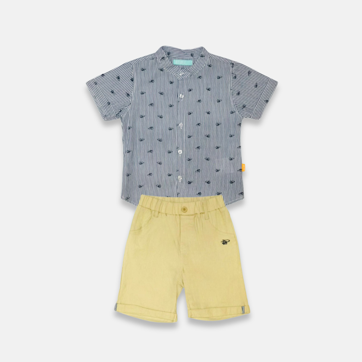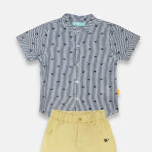Composto por uma camisa social de botão e um shorts de sarja. Esse conjunto é a escolha ideal para deixar seu pequeno elegante e confortável em eventos ou passeios.
