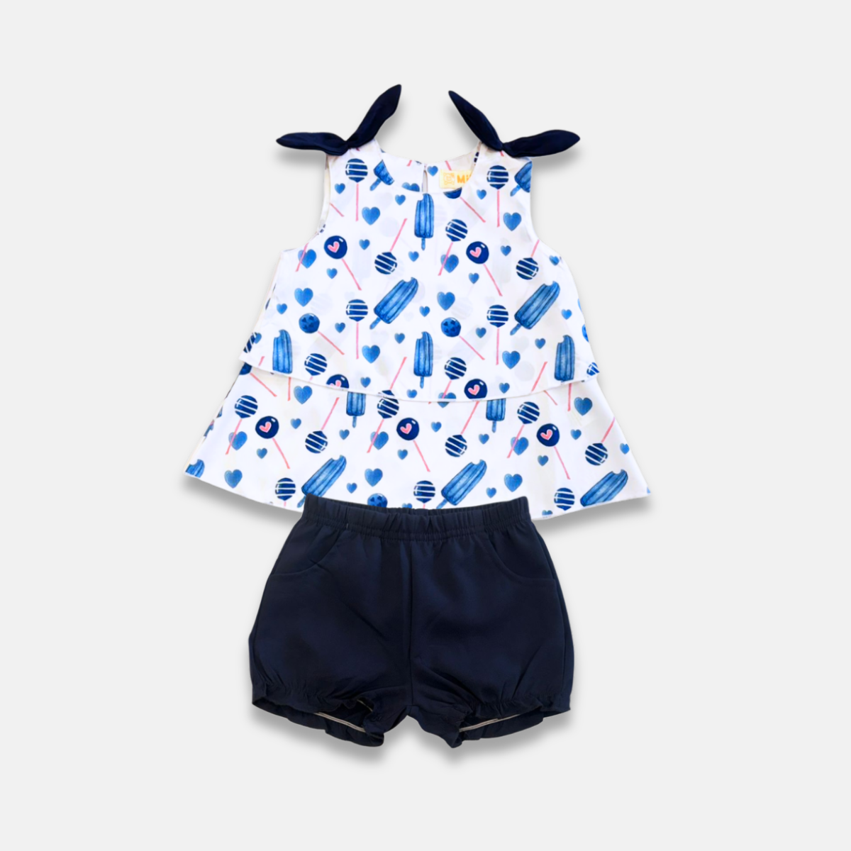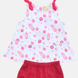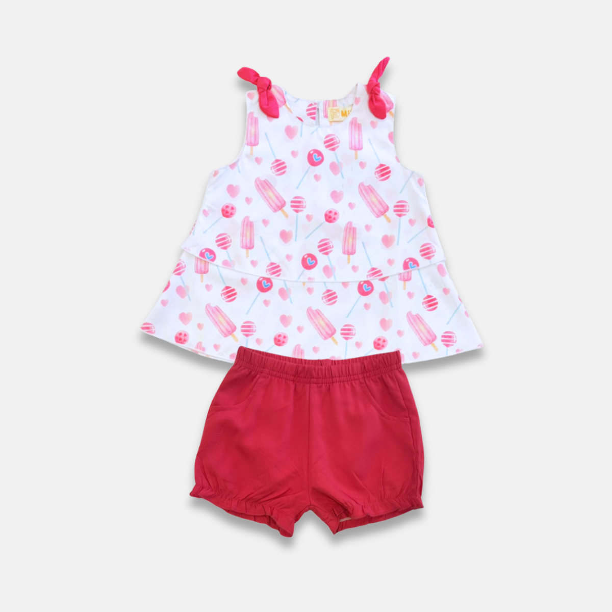 Conjunto Picolé Baby Menina é uma opção divertida e refrescante para os pequenos nos dias mais quentes. Com uma estampa temática de picolé, esse conjunto traz um toque alegre e descontraído, ideal para o verão ou momentos de lazer.
