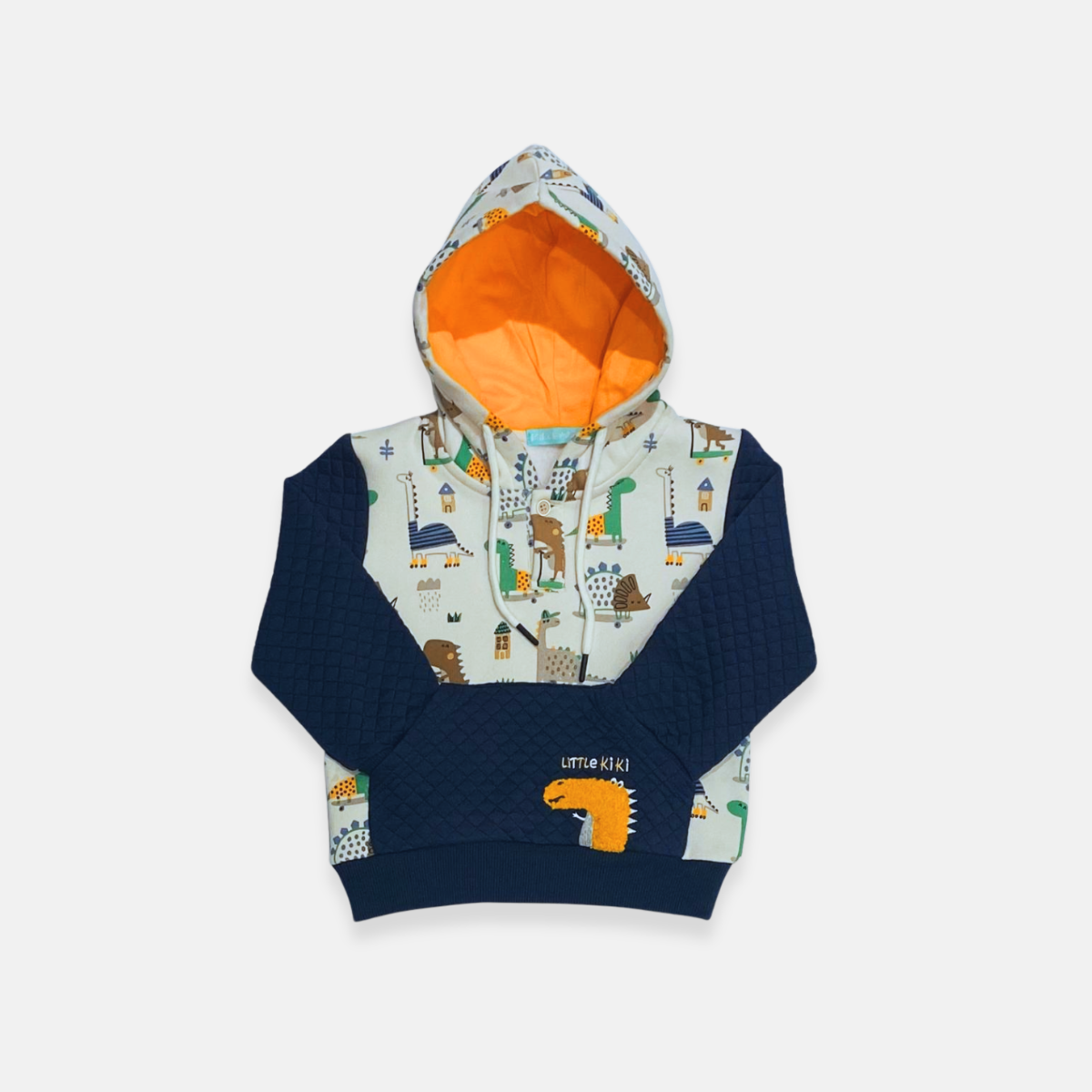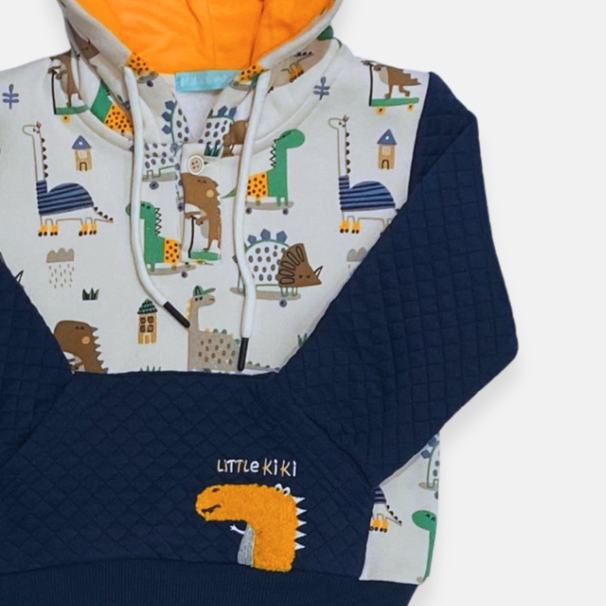 Na parte inferior, o bordado Little Kiki acompanhado de um simpático dinossauro adiciona um detalhe charmoso e exclusivo à blusa.